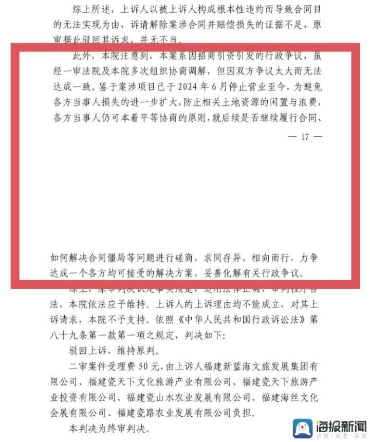 福建省高院表示:本院注意到,本案系因招商引资引发的行政争议,虽经一审法院及本院多次组织协商调解,但因双方争议太大而无法达成一致。鉴于案涉项目已于2024年6月停止营业至今,为避免各方当事人损失的进一步扩大,防止相关土地资源的闲置与浪费,各方当事人仍可本着平等协商的原则,就后续是否继续履行合同、如何解决合同僵局等问题进行磋商,求同存异、相向而行,力争达成一个各方均可接受的解决方案,妥善化解有关行政争议。
