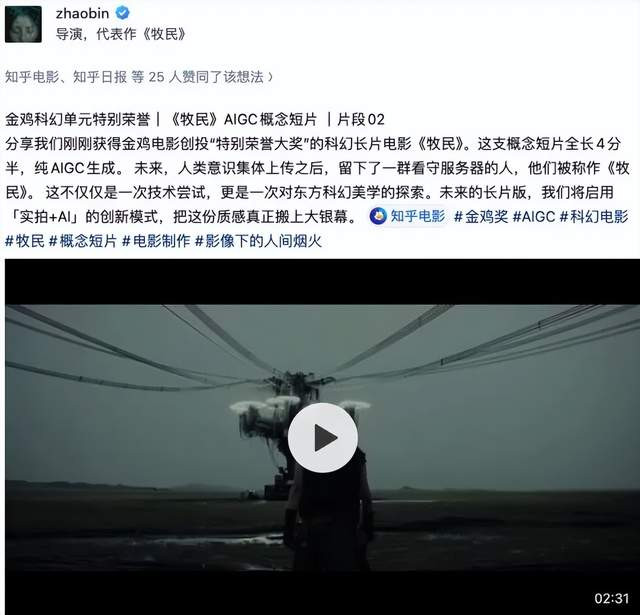 一如此次入围作品《人生不相见》的导演赵斌,其之前所发布的AIGC 概念短片《牧民》就有知乎网友评价:“这不仅仅是一次技术尝试,更是一次对东方科幻美学的探索。”“AIGC 的意义就是可能性,感觉思想在呼吸。”这些反馈既来自审美判断,也体现了社区内对技术与叙事关系的主动思考。