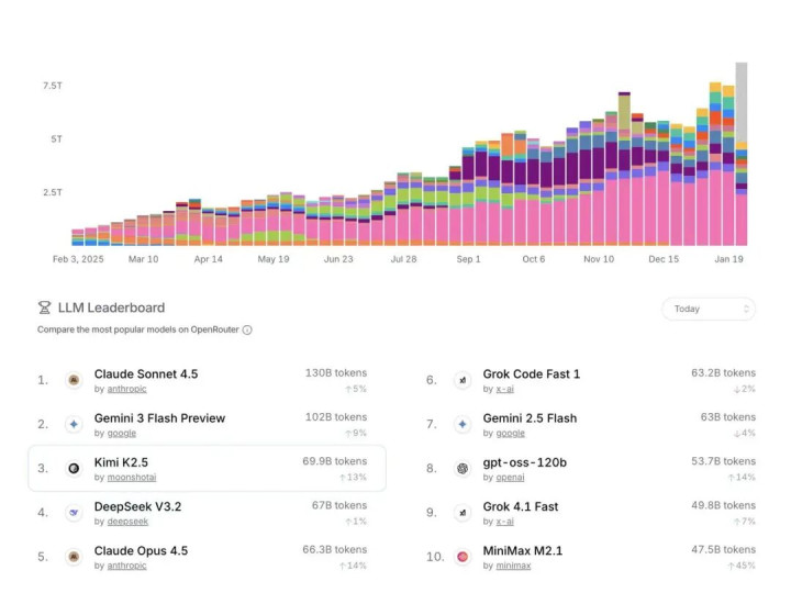 在Openrouter上,K2.5的排名已经来到第三位,仅次于ClaudeSonnet4.5和Gemini3Flash。