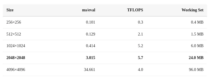 256×256矩阵受限于调度开销:在0.101毫秒的运行时间中,大部分(约0.095毫秒)消耗于XPC和IOKit框架的通信,真正的计算仅占约0.006毫秒。