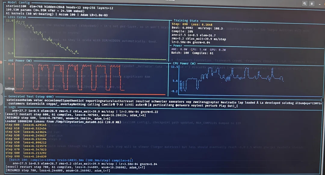 更惊人的是,最新更新已实现完整Stories110M模型(109百万参数,12层Llama-2架构)在TinyStories数据集上的训练,损失实时下降,功耗低到「小于一瓦特」。