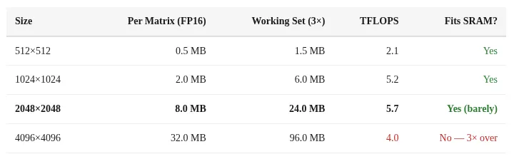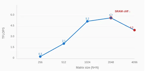 性能在4096尺寸时显著下降:从2048尺寸时的5.7 TFLOPS降至4096尺寸时的4.0 TFLOPS,这表明存在资源溢出问题。