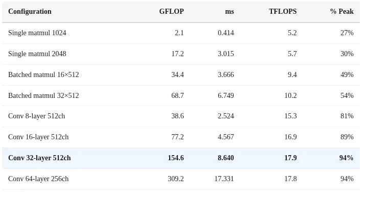 在32层以上的深度网络中达到94%的利用率,意味着几乎测量了硬件的原始极限能力。