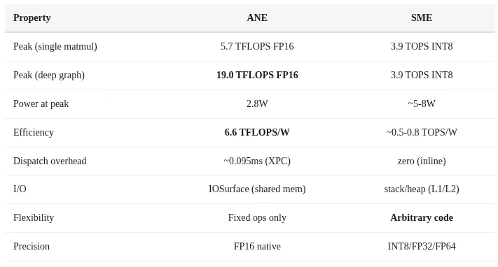 适合使用SME的场景:单token解码(零调度开销)、ANE不支持的自定义运算、小矩阵运算、任何需要FP32+精度的计算。