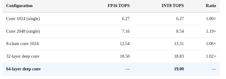 这符合行业惯例,即将INT8操作数视为FP16的两倍。但硬件实际上并不能以两倍的速度执行INT8运算。
