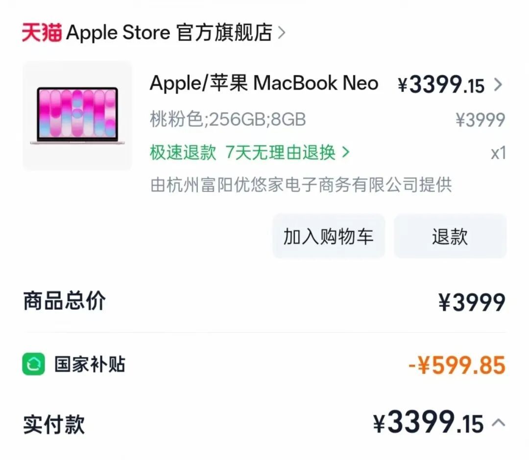 但别忘了,MacBook Neo 也是可以参与教育优惠的,并且在天猫 Apple Store 官方旗舰店还能叠加国补。