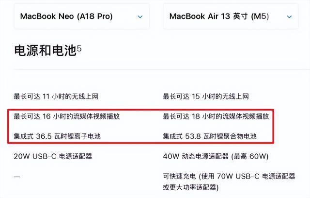 除此之外,它的电池容量也只有 36.5Wh ,而 MacBook Air 可是有 53.8Wh ,但它俩的官方续航却只差了两个小时。
